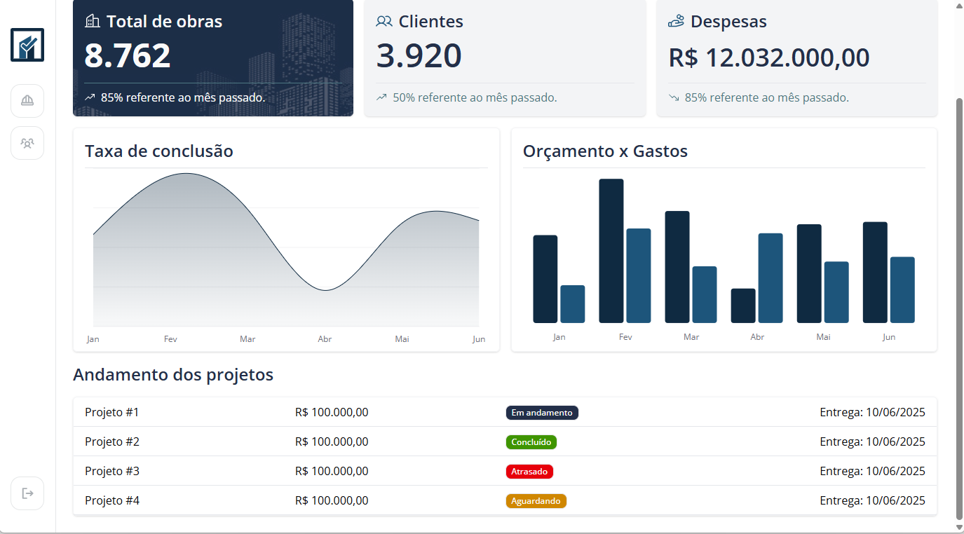 Um dashboard completo e personalizado para acompanhar todas as suas obras.