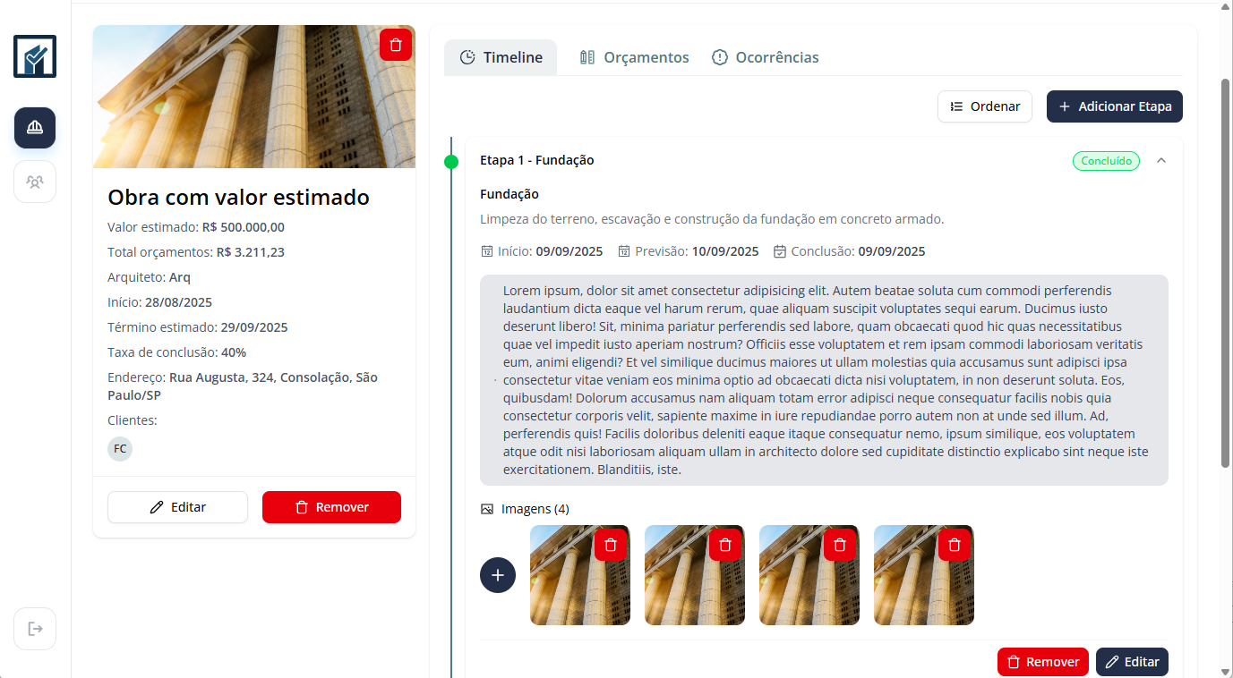 💻 Dashboard administrativo – visualize o andamento financeiro, timeline da obra, notificações, orçamentos e muito mais!