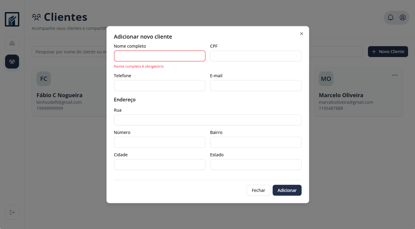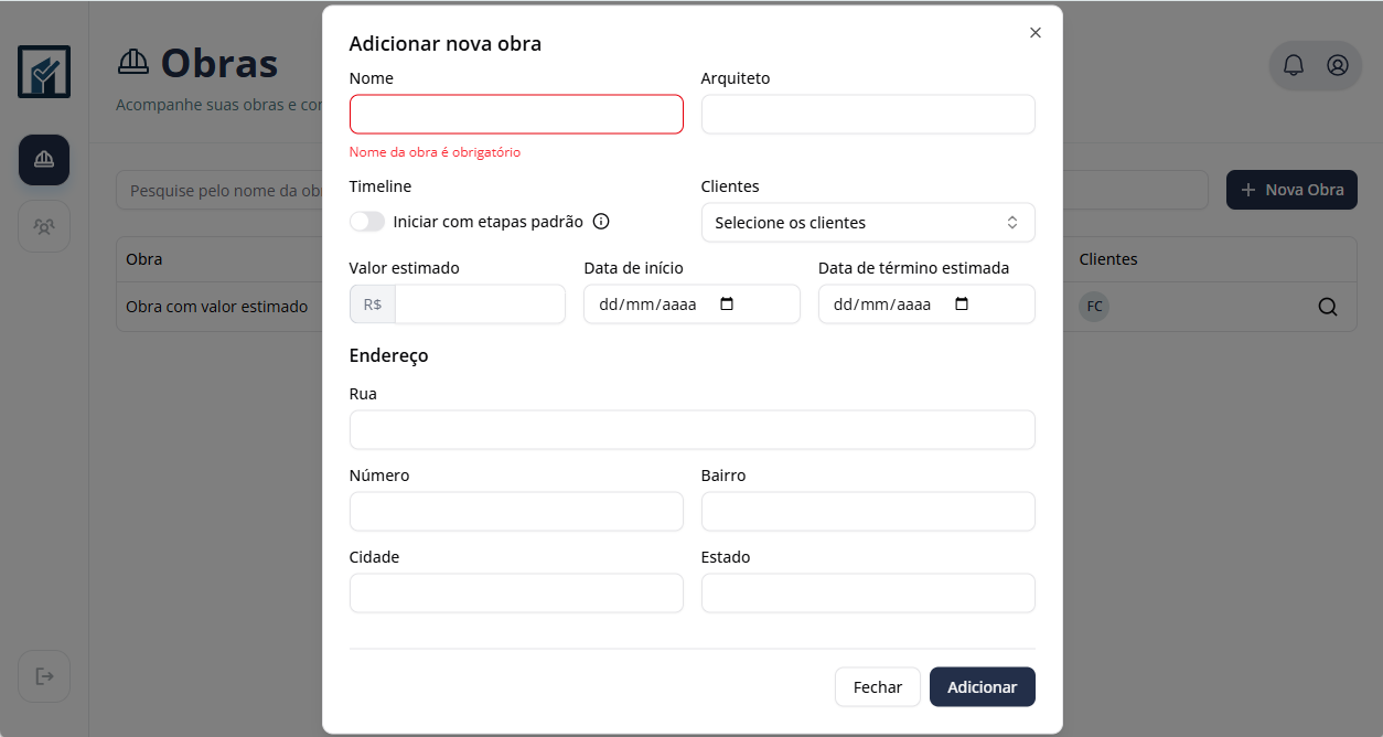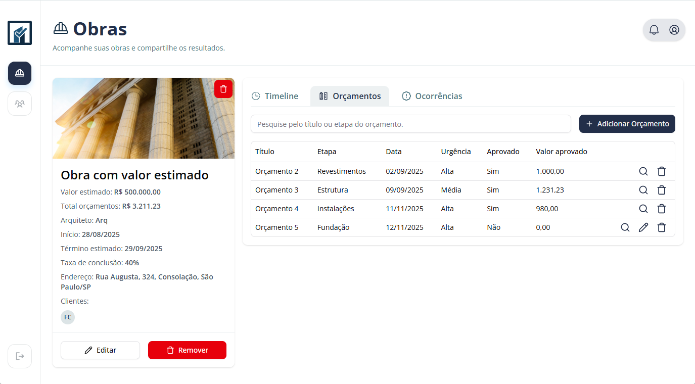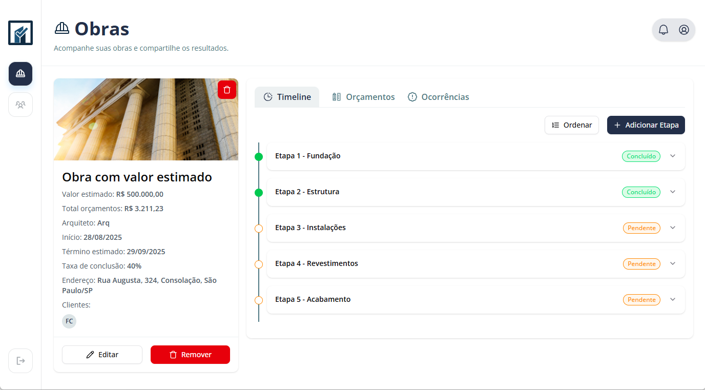 Organize suas obras por cliente, com todas as informações relevantes em um só lugar.